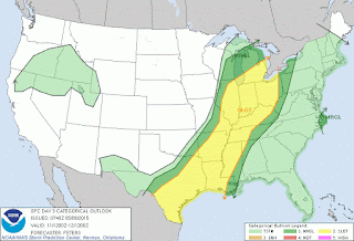 This is a Slight Risk for Severe Weather issued by Storm Prediction Center in Norman Oklahoma. This is Valid Monday for when that front FINALLY push on through the State. There is a risk for severe weather as that front moves through. The main threats are Heavy RAIN and FLOODING, strong possibility damaging thunderstorm winds, and Large Hail.